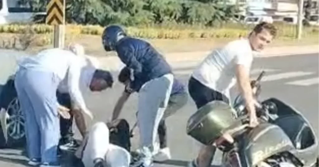 Görüntülerde, motosiklet sürücüsünün aniden yere düştüğü ve çevredeki diğer araçların hızlı bir şekilde yavaşlayarak durduğu görülürken, diğer sürücülerin dikkati sayesinde zincirleme bir kaza önlendi.