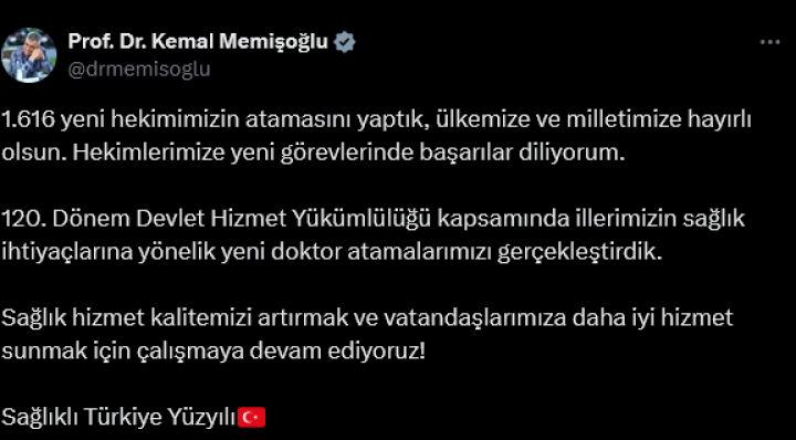 120. Dönem Devlet Hizmet Yükümlülüğü kapsamında illerin sağlık ihtiyaçlarına yönelik bin 616 yeni doktor ataması gerçekleştirdi. ANKARA...