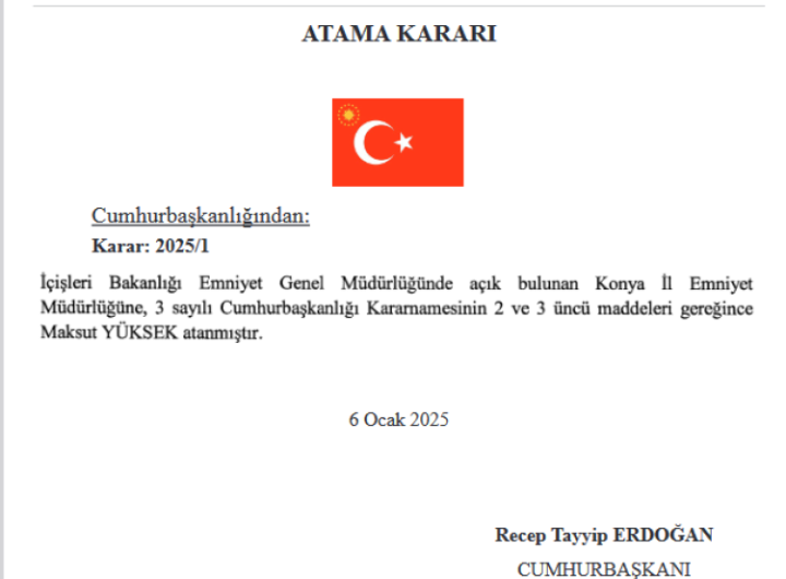 Cumhurbaşkanı Erdoğan imzasıyla Konya Emniyet Müdürlüğü’ne 1. Sınıf Emniyet Müdürü Maksut Yüksek atandı. ANKARA (İGFA) – Cumhurbaşkanı...