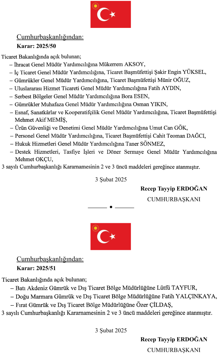 Aynı kararname kapsamında; Ticaret Bakanlığı’nda açık bulunan Genel Müdür Yardımcılıkları ile Batı Akdeniz, Doğu Marmara ve Fırat Gümrük ve Dış Ticaret Bölge Müdürlüklerine de yeni atamalar gerçekleştirildi.