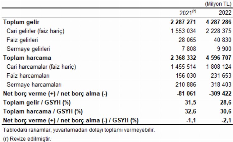 Genel devlet açığının Gayrisafi Yurt İçi Hasıla’ya oranı 2022 yılında yüzde 2,1 oldu. Türkiye İstatistik Kurumu, 2022 yılına ilişkin Devlet Hesaplar Raporu’nu yayımladı.
