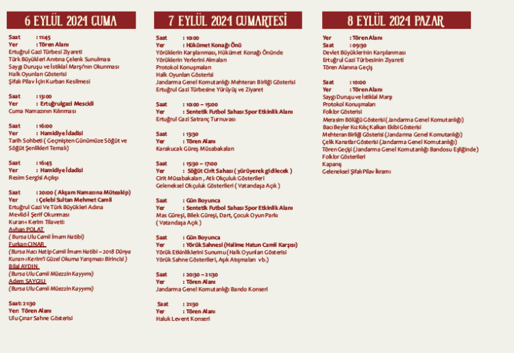 7 Eylül Cumartesi günü yapılacak etkinlikler, saat 10:00’da Hükümet Konağı önünde Yörüklerin karşılanmasıyla başlayacak. Protokol konuşmalarının ardından, Mehteran Birliği gösterisi ve Jandarma Genel Komutanlığı’nın gösterilerinin ardından Ertuğrul Gazi Türbesi’ne yürüyüş gerçekleştirilecek.