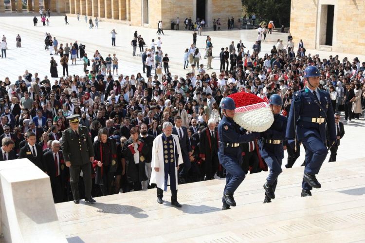 Ankara Üniversitesi yönetimi, akademisyenler ve öğrenciler, “Bilim Ateşi Yakma Töreni”nin ardından Cumhuriyetimizin kurucusu Gazi Mustafa Kemal Atatürk’ün ebedi istirahatgâhı olan Anıtkabir’i ziyaret etti. Rektör Ünüvar, Atatürk’ün mozolesine çelenk sunduktan sonra Anıtkabir Özel Defteri’ni imzaladı.