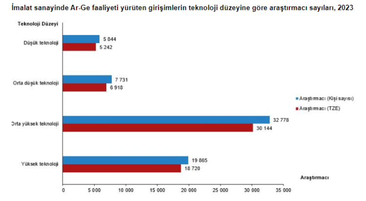 İmalat sanayinde Ar-Ge faaliyeti yürüten girişimlerdeki araştırmacı sayıları incelendiğinde 2023 yılında en fazla araştırmacının 32 bin 778 kişi ile orta yüksek teknoloji faaliyeti yürüten girişimler tarafından istihdam edildiği görüldü. Bunu 19 bin 865 araştırmacı istihdamı ile yüksek teknoloji faaliyeti yürüten girişimler takip etti. TZE cinsinden araştırmacı sayıları dikkate alındığında da en fazla değerin 30 bin 144 ile orta yüksek teknoloji faaliyeti yürüten girişimlerde olduğu saptandı.
