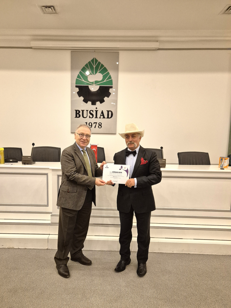 Soruları da yanıtlayan Prof. Dr. Ahmet Ayhan Çitil ve Bursa Felsefe Derneği Başkanı Gürkan Kaya’ya söyleşi sonunda, Çağdaş Eğitim Kooperatifi’nin “Kır Çiçekleri Okusun Diye” sosyal sorumluluk projesi, adlarına yapılan bağışın sertifikası, BUSİAD Yüksek Danışma Kurulu Başkanı Ergun Hadi Türkay tarafından sunuldu.