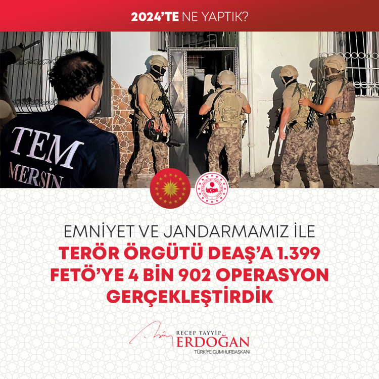 2024 yılında hükümetin icraatlarını özetleyen Cumhurbaşkanı Erdoğan, “Aziz milletimize hizmet yolunda, 2024 yılında da durmadan, dinlenmeden, gece gündüz demeden aşkla çalıştık; ülkemize her alanda çok önemli eserler, hizmetler, projeler, yatırımlar kazandırdık. 2025 yılına girerken bu hizmetleri bir özetleyelim, hatırlayalım…” ifadelerini kullandı.