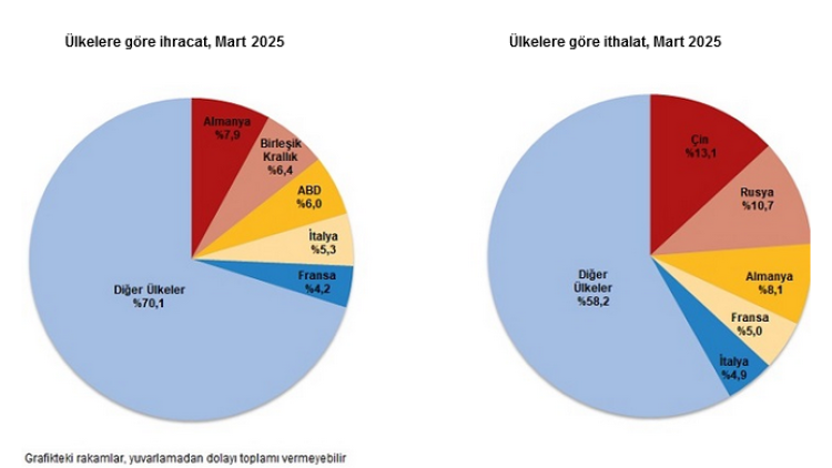 İthalatta Çin ilk sırayı aldı. Mart ayında Çin’den yapılan ithalat 4 milyar 6 milyon dolar olurken, bu ülkeyi sırasıyla; 3 milyar 282 milyon dolar ile Rusya Federasyonu, 2 milyar 488 milyon dolar ile Almanya, 1 milyar 525 milyon dolar ile Fransa, 1 milyar 504 milyon dolar ile İtalya izledi. İlk 5 ülkeden yapılan ithalat, toplam ithalatın yüzde 41,8’ini oluşturdu.