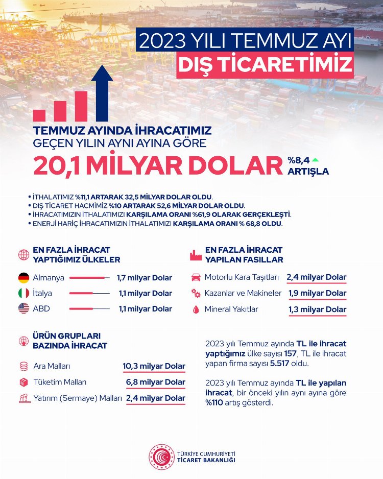 Temmuz ayına ilişkin ortaya çıkan verilere göre, ihracat geçen yılın aynı ayına göre yüzde 8,4 artışla 20 milyar 93 milyon dolar oldu.