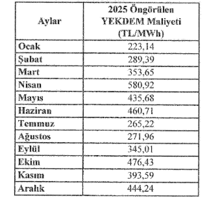 EPDK ayrıca yenilenebilir Enerji Kaynaklarının Belgelendirilmesi ve Desteklenmesine İlişkin Yönetmeliğin ilgili maddesinde 2025 yılı için tedarik edilen birim enerji miktarı başına öngörülen YEKDEM maliyetlerini de güncelledi.