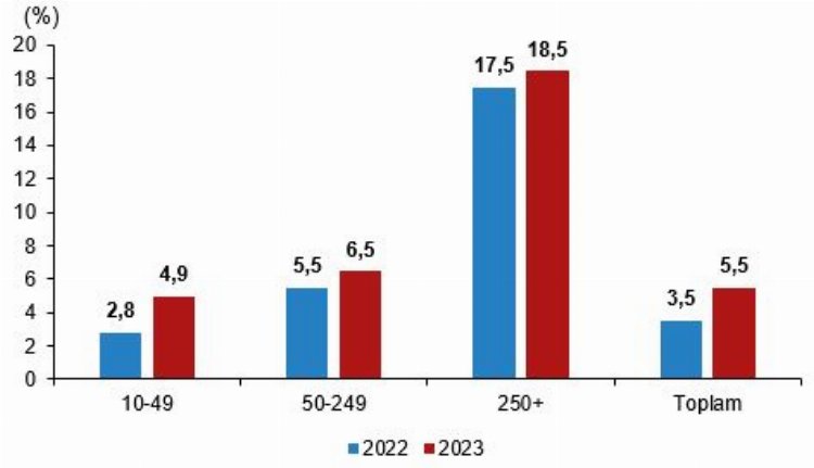 Çalışan sayısı büyüklük grubuna göre yapay zeka kullanan girişimlerin oranı, 2022, 2023