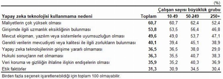 Ücretli bulut bilişim kullanımı 250 ve üzeri çalışanı olan girişimlerde yüzde 48,2 olurken, girişimlerin yüzde 5,5’i yapay zeka kullandığını belirtti