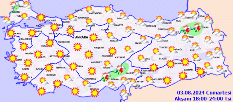 Meteoroloji Genel Müdürlüğü olarak yapılan değerlendirmelere göre: Ülkemizin kuzey kesimleri ve Doğu Akdeniz’in parçalı bulutlu, Doğu Karadeniz kıyı illerinin iç kesimleri, Doğu Anadolu’nun kuzeydoğusu ve Doğu Akdeniz’in Toroslar kesimi ile Artvin çevreleri ve Edirne’nin kuzey kesimlerinin yer yer çok bulutlu yerel sağanak ve gök gürültülü sağanak yağışlı, diğer yerlerin az bulutlu ve açık geçeceği tahmin ediliyor.