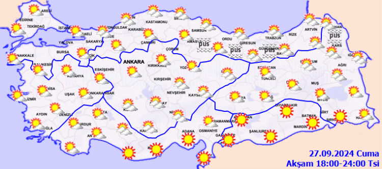 Meteoroloji Genel Müdürlüğü tarafından son tahminlere göre: Ülkemizin kuzeydoğu kesimlerinin parçalı bulutlu, Ordu, Giresun, Trabzon ve Rize’nin iç kesimleri ile Artvin’in kuzeyinin yerel sağanak yağışlı, diğer yerlerin az bulutlu ve açık geçeceği tahmin ediliyor. Sabah ve gece saatlerinde Marmara’nın doğusu ile Karadeniz’in iç kesimlerinde yer yer pus ve sis bekleniyor.