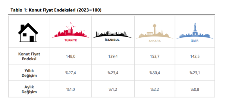 Endeks değerleri geçen yılın aynı ayına göre ise İstanbul’da yüzde 23,4, Ankara’da yüzde 30,4 ve İzmir’de yüzde 23,1 yükseldi.