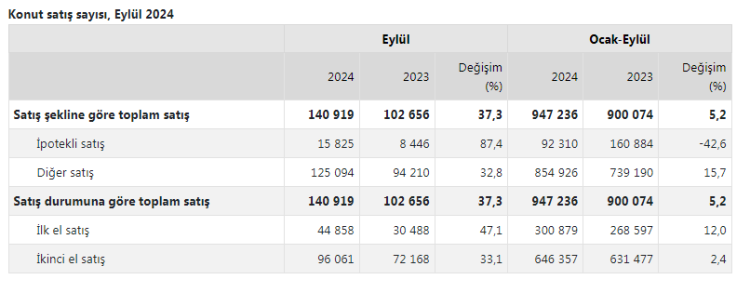 Türkiye İstatistik Kurumu (TÜİK) Türkiye genelinde konut satışları Eylül ayında bir önceki yılın aynı ayına göre yüzde 37,3 oranında artarak 140 bin 919 oldu.