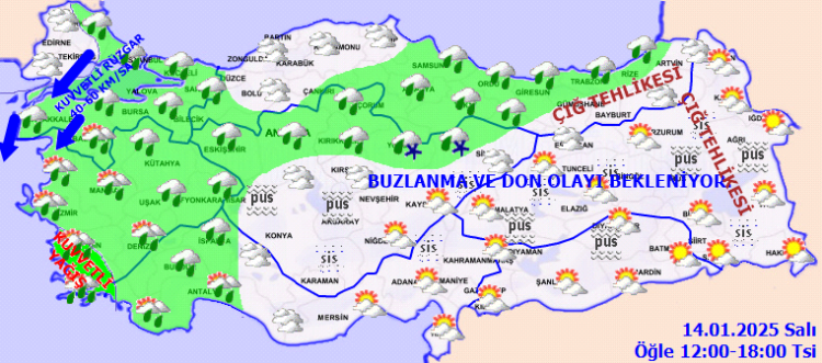 Yağışların Kıyı Ege ile Balıkesir’in batı ilçeleri ve Denizli çevrelerinde yer yer kuvvetli olacağı tahmin ediliyor. Ülkemizin iç ve doğu kesimlerinde buzlanma ve don ile birlikte pus ve yer yer sis bekleniyor. Doğu Karadeniz’in iç kesimlerinin yüksekleri ile Doğu Anadolu’nun yüksek ve dik yamaçlarında çığ tehlikesi bulunmaktadır.