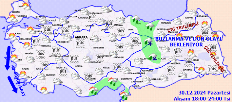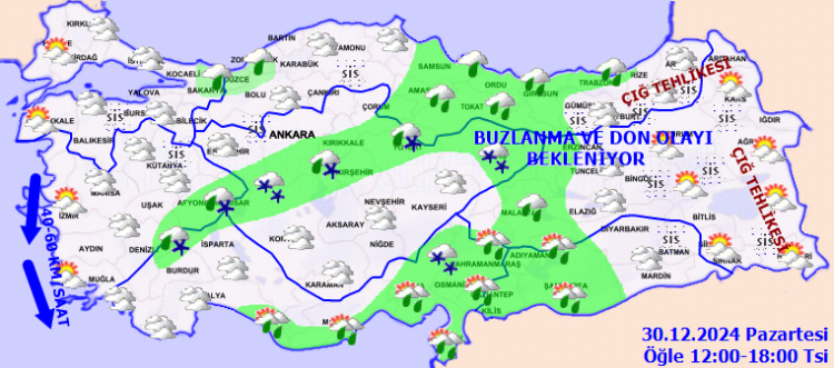Türkiye’nin iç ve doğu kesimlerinde buzlanma ve don ile birlikte pus ve sis beklenirken, Doğu Karadeniz’in iç kesimlerinin yüksekleri ile Doğu Anadolu’nun doğusunun yüksek ve dik yamaçlarındaki çığ tehlikesine yönelik olumsuzluklara karşı dikkatli ve tedbirli olunması istendi.