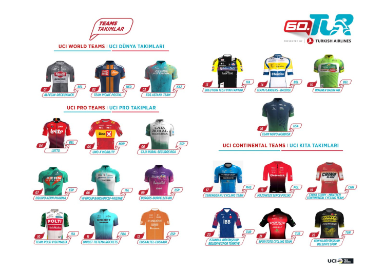 1963 yılında Marmara Turu olarak başlayan, 1965 yılında uluslararası nitelik kazanarak Cumhurbaşkanlığı himayelerine alınan, Türk bisikletinin gelişimine katkı sağlayan 60.Cumhurbaşkanlığı Türkiye Bisiklet Turu’na 12 ülkeden 3 World Tour Team, 13 Pro Team, 6 Continental Team olmak üzere 22 takım katılacak.