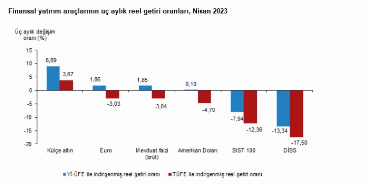 Yİ-ÜFE ile indirgendiğinde; yatırım araçlarından Euro yüzde 3,34, Amerikan Doları yüzde 0,92, mevduat faizi (brüt) yüzde 0,65 oranlarında yatırımcısına reel getiri sağlarken; BIST 100 endeksi yüzde 4,15 ve Devlet İç Borçlanma Senetleri (DİBS) yüzde 8,99 oranlarında yatırımcısına kaybettirdi.