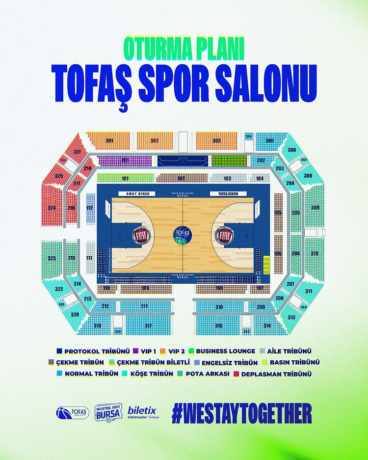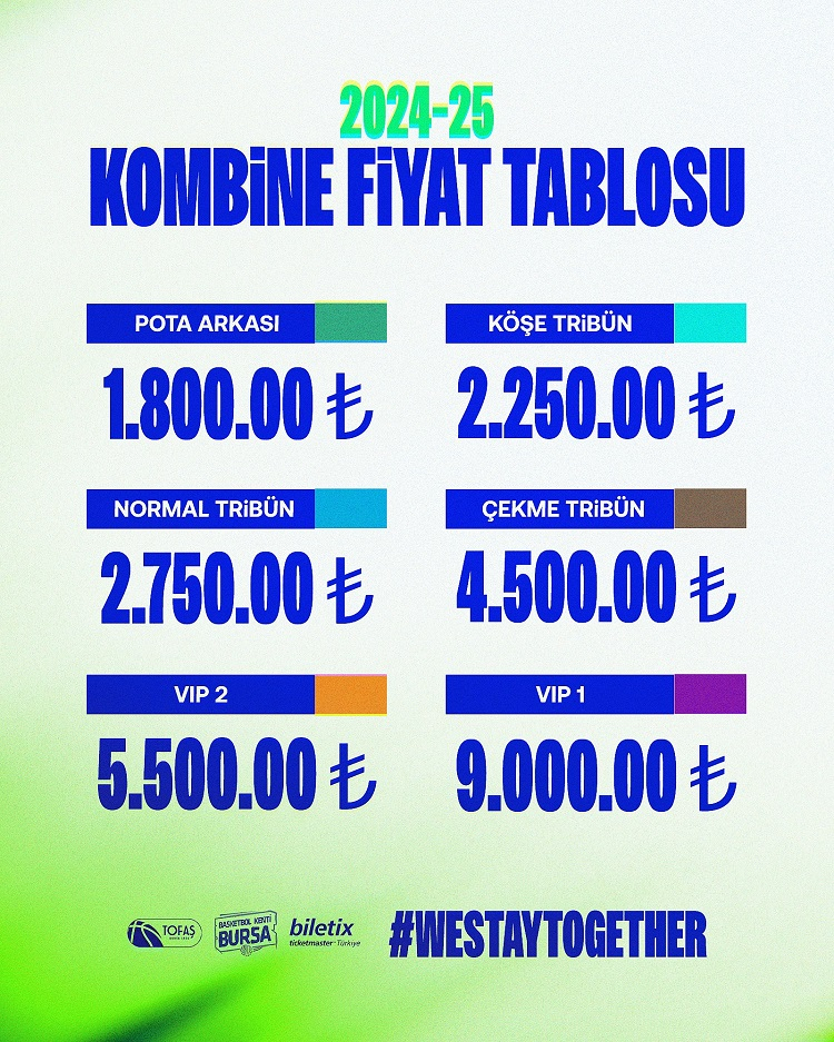 TOFAŞ Basketbol Takımı yeni sezon kombineleri 2024-2025 sezonunda iç sahada oynanacak (Hazırlık, Avrupa kupası, muhtemel Basketbol Süper Ligi play-in ve play-off müsabakaları ve muhtemel Türkiye Kupası müsabakaları da dahil olmak üzere) tüm maçlarda geçerlidir.
