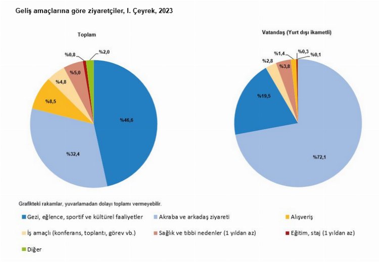 Bu çeyrekte ziyaretçiler Türkiye’yi yüzde 46,6 ile en çok “gezi, eğlence, sportif ve kültürel faaliyetler” amacıyla ziyaret ederken, ikinci sırada yüzde 32,4 ile “akraba ve arkadaş ziyareti”, üçüncü sırada ise ile yüzde 8,5 ile “alışveriş” yer aldı. Yurt dışı ikametli vatandaşlar ise ülkemize yüzde 72,1 ile en çok “akraba ve arkadaş ziyareti” amacıyla geldi.
