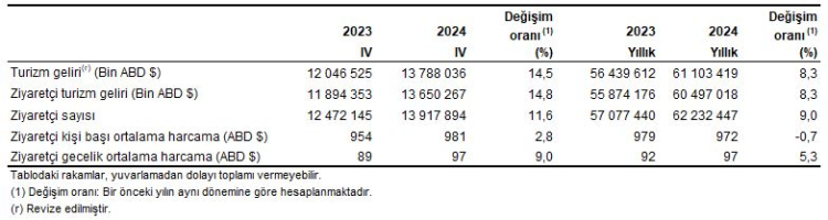 Turizm geliri Ekim, Kasım ve Aralık aylarından oluşan IV. çeyrekte bir önceki yılın aynı çeyreğine göre yüzde 14,5 artarak 13 milyar 788 milyon 36 bin dolar oldu. Ziyaretçilerden elde edilen turizm geliri 13 milyar 650 milyon 267 bin dolar, transfer yolculardan elde edilen turizm geliri ise 137 milyon 769 bin dolar oldu. Ziyaretçilerin turizm gelirinin yüzde 19,5’i ülkemizi ziyaret eden yurt dışı ikametli vatandaşlardan elde edildi.