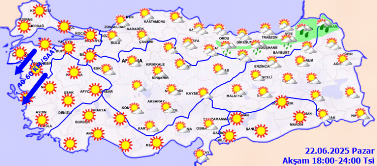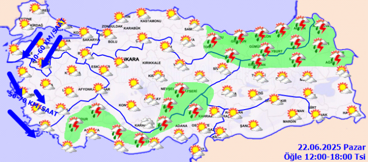 Rüzgarın Marmara’nın batısı ve Kıyı Ege’de kuzey yönlerden kuvvetli ve yer yer kısa süreli fırtına (40-70 km/saat) şeklinde esmesi beklendiğinden yaşanabilecek olumsuzluklara karşı dikkatli ve tedbirli olunması gerekmektedir.