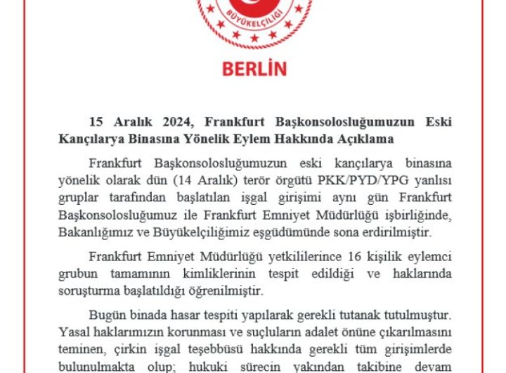 ANKARA (İGFA) – Türkiye Cumhuriyeti Berlin Büyükelçiliği’nden yapılan açıklamada, Frankfurt Başkonsolosluğu’nun eski kançılarya binasına yönelik olarak 14...