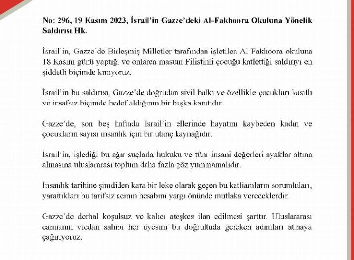 İsrail’in Gazze’de Birleşmiş Milletler (BM) bünyesindeki El-Fahura Okulu’na yaptığı saldırıya Dışişleri Bakanlığı’ndan kınama geldi. ANKARA (İGFA) –...