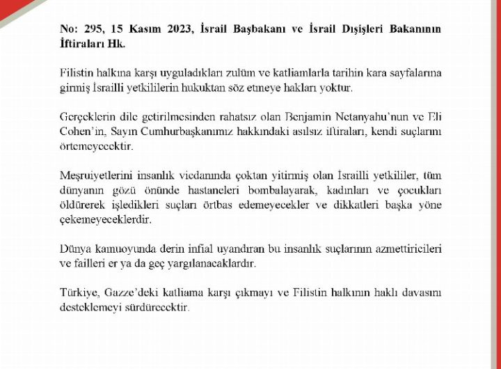 Dışişleri Bakanlığı, İsrail Başbakanı Netanyahu ve Dışişleri Bakanı Cohen’in Cumhurbaşkanı Erdoğan hakkındaki sözlerine tepki gösterdi. ANKARA (İGFA)...