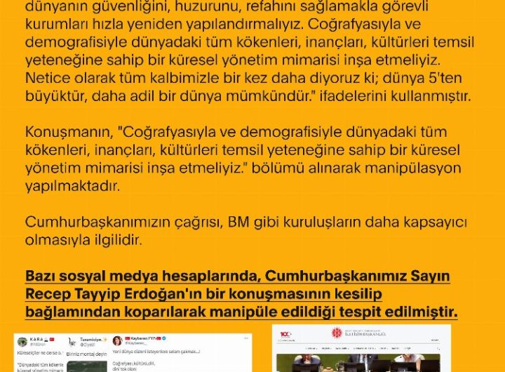 Cumhurbaşkanı Erdoğan’ın BM’deki konuşmasının manipüle edilmesine ilişkin açıklama İletişim Başkanlığı’ndan geldi. ANKARA (İGFA) – İletişim Başkanlığı Dezenformasyonla...