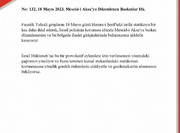 Dışişleri Bakanlığı, Yahudilerin Mescid-i Aksa’ya baskın düzenlemesini şiddetle kınadı. ANKARA (İGFA) – Dışişleri Bakanlığı’nan yapılan yazılı açıklamada...