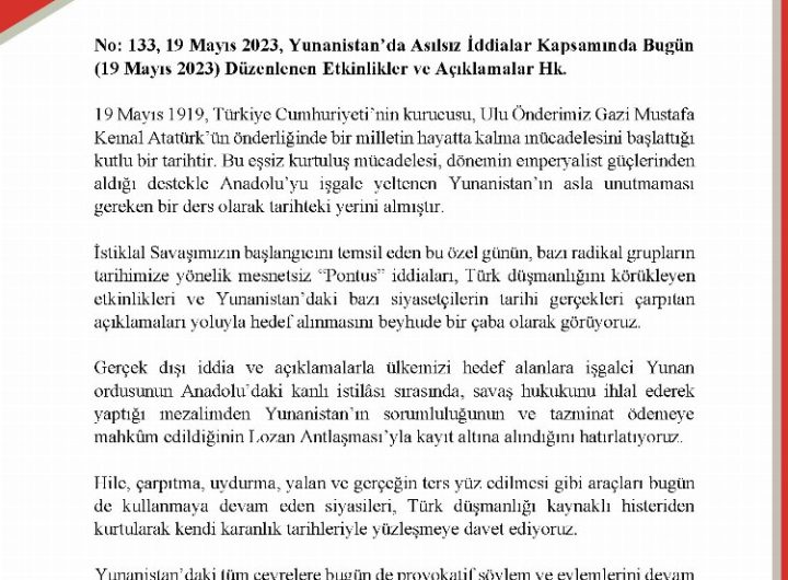 Dışişleri Bakanlığı, Yunanistan’daki ‘Pontus’ yorumlarına sert bir açıklama ile yanıt verdi. Açıklamada, “Yunanistan’daki tüm çevrelere bugün de...