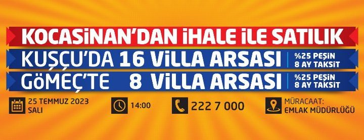 Kayseri’nin Kocasinan Belediyesi, Kayseri’nin denizi Kuşçu ve Gömeç’de bulunan 24 adet villa arsasını, yüzde 25 peşin ve...