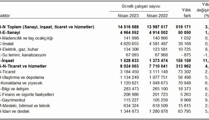 Sanayi, inşaat ve ticaret-hizmet sektörleri toplamında ücretli çalışan sayısı 2023 Nisan ayında bir önceki yılın aynı ayına...