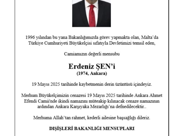 ANKARA (İGFA) – Dışişleri Bakanlığı, Malta’da Türkiye Cumhuriyeti Büyükelçisi olarak görev yapan Erdeniz Şen’in (51) hayatını kaybettiğini...