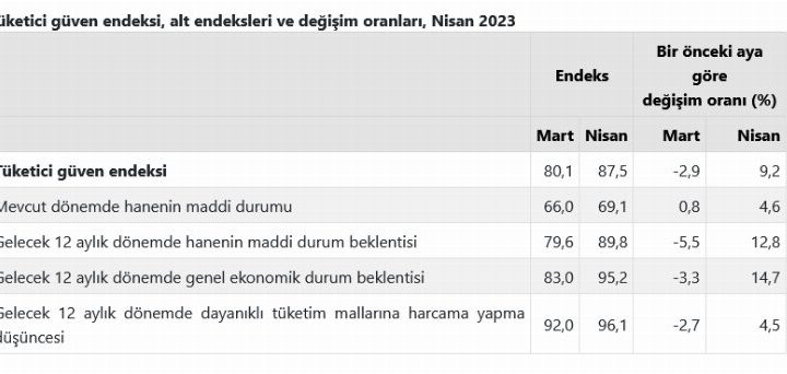 TÜİK verilerine göre, Tüketici Güven Endeksi Nisan ayında bir önceki aya göre yüzde yüzde 9,2 oranında arttı....
