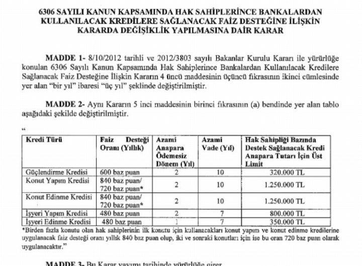 Afet riskli alanların dönüştürülmesi hakkındaki kanun kapsamında bankalardan kullanılacak kredilere sağlanacak faiz desteğinde güncellemeye gidildi. Desteğe esas...