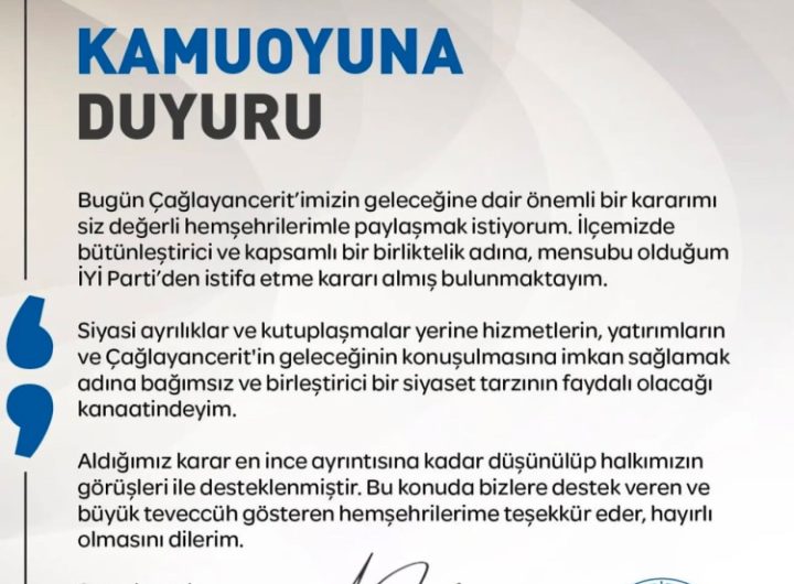 Kahramanmaraş’ta Çağlayancerit Belediye Başkanı Yemliha Göktaş, yaptığı yazılı açıklama ile İYİ Parti’den istifa etti. Tural ŞAHBAZLI /...