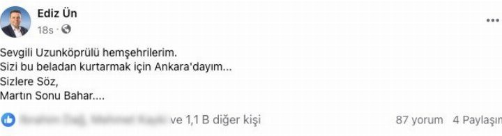 CHP Edirne Milletvekili Ediz Ün’ün, sosyal medya hesabından yaptığı bir paylaşım ve sonrasında kendisinin paylaşıma yorum yapan...