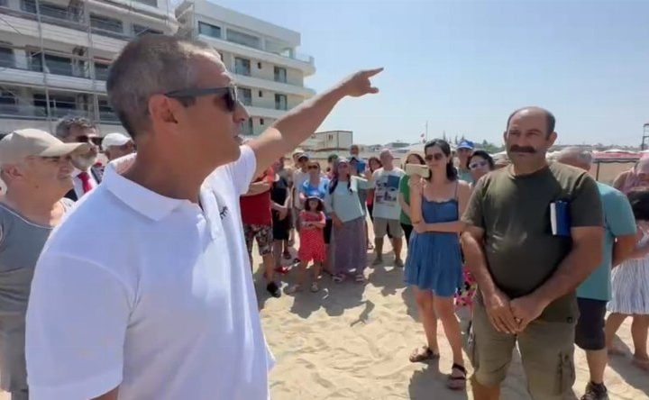 Zafer Partisi Genel Başkan Yardımcısı Uğur Batur, Balıkesir Altınova sahilinde yönetmeliklere aykırı yapılan bir otelin önünde basın...
