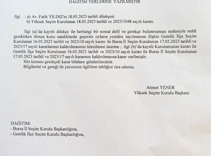 Yüksek Seçim Kurulu (YSK), Gemlik İlçe ve Bursa İl Seçim Kurullarının hukuka aykırı verdiği Gemlik’teki 169 sandıkta...