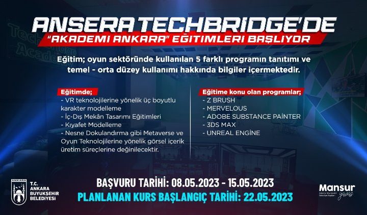 Ankara Büyükşehir Belediyesinin ‘Oyun ve Metaverse Teknolojileri Tasarım Eğitimi’ yeniden başlıyor. Ansera TechBridge’de Akademi Ankara adı altında...